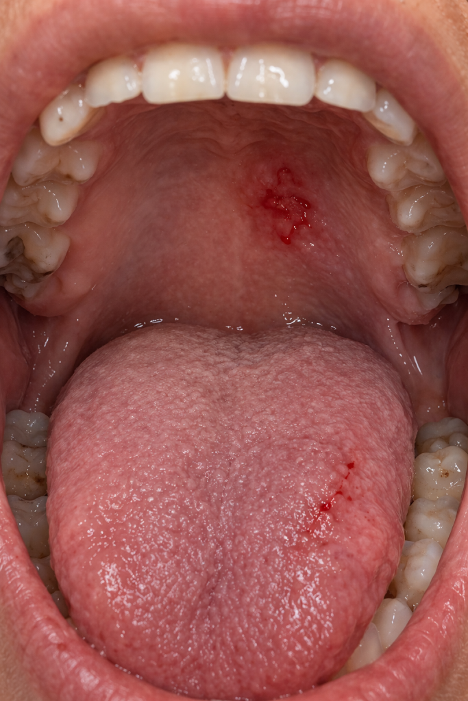 Morderte accidentalmente, rozar con un diente filoso o una prótesis mal ajustada.